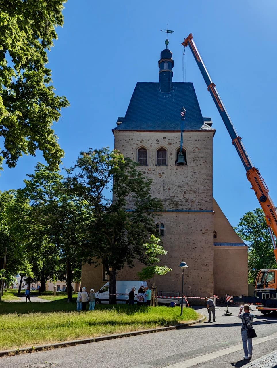 Mit einem Gewicht von etwa 1,5 Tonnen hängt sie stolz als größte Glocke im Turm der Kirche. Leider hat die Zeit ihre Spuren hinterlassen. Die Glocke hat Risse bekommen, die eine professionelle Reparatur erfordern. Da dies keine Aufgabe für jedermann ist, muss sie in einem spezialisierten Unternehmen in den Niederlanden geschweißt werden. Die Verantwortung für diese anspruchsvolle Aufgabe liegt in den Händen von Christian Beck. Beck ist der Inhaber eines Unternehmens aus dem thüringischen Kölleda, das sich auf die Reparatur von Glocken und Turmuhren spezialisiert hat. Mit seinem erfahrenen Team hat er das meterdicke Mauerwerk des Kirchturms geöffnet, um die Glocke sicher nach unten zu transportieren.