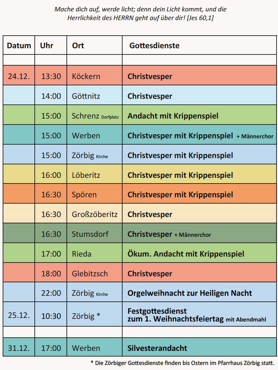 Am 24. Dezember laden wir Sie herzlich zu unseren Gottesdiensten an Heiligabend ein. In allen Gemeinden erwarten Sie besinnliche Christvespern, zum Teil mit Kinder- oder Erwachsenenkrippenspiele,  sowie festliche Weihnachtsmusik. Diese Gottesdienste bieten Raum um innezuhalten, der Weihnachtsbotschaft zu lauschen und gemeinsam die Geburt Christi zu feiern. Alle Uhrzeiten und Orte finden Sie im aktuellen Gottesdienstplan.