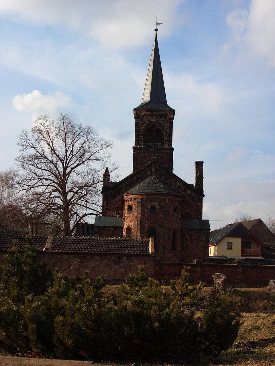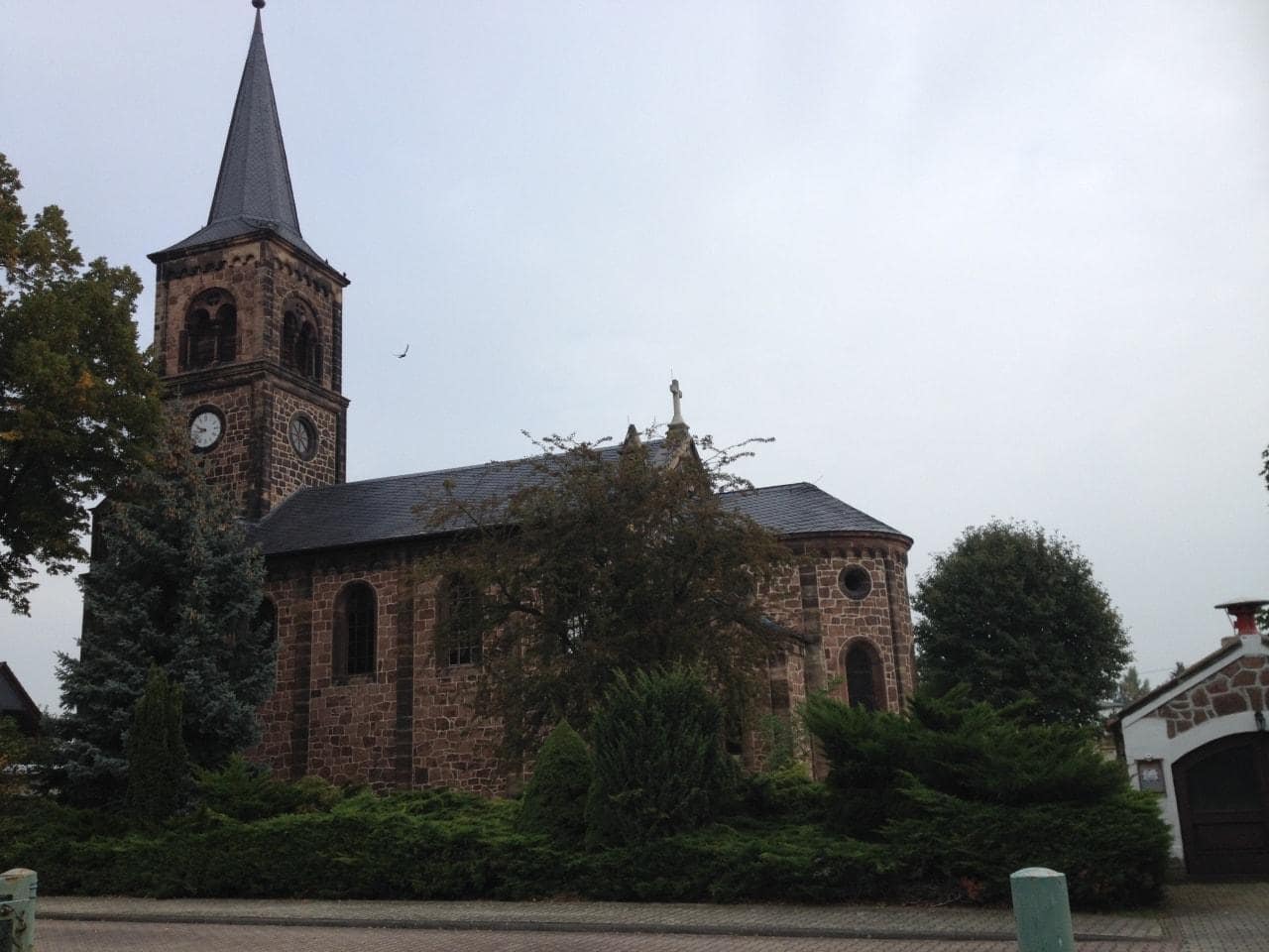 Die Kirche nördlich vom Dorfe ist ein 1877 erbautes, 1878 eingeweihtes Bauwerk. Das Gebäude ist in Bruchsteinen von Porphyr und zu den Kunstformen mit grauen Sandsteinen in romanisirenden Formen ausgeführt. An dem Schiffe liegt östlich der Altarraum mit Apside, südlich ist die Sacristei, nördlich die Taufkapelle angebaut. Auch an dem im Grundrisse quadratischen Turme, welcher mit achtseitigem Helme bedacht ist, sind seitliche Ausbauten für Treppen.